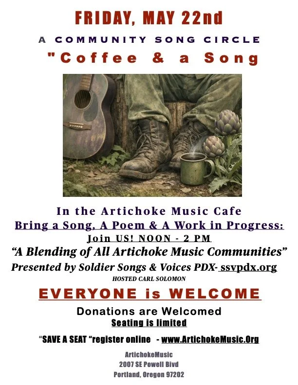 We'll be on Zoom May 3 and 10 and at Artichoke Community Music on May 17.